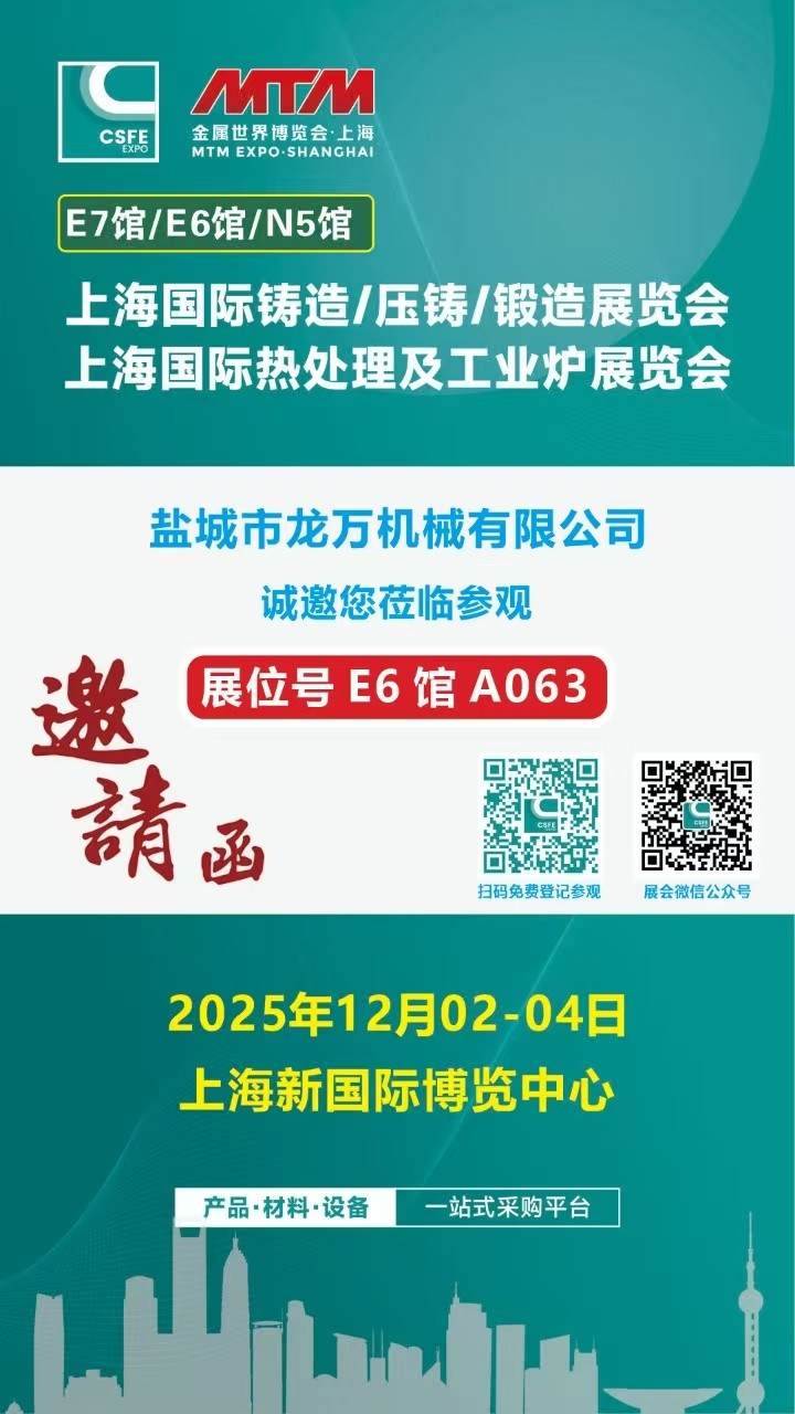 Yancheng Longwan Machinery Co., Ltd. จะเข้าร่วมใน "นิทรรศการเหล็ก/การหล่อ/โรงหล่อนานาชาติเซี่ยงไฮ้" และ "นิทรรศการการอบชุบด้วยความร้อนและเตาอุตสาหกรรมนานาชาติเซี่ยงไฮ้" ซึ่งจัดขึ้นที่ศูนย์นิทรรศการนานาชาติเซี่ยงไฮ้ ตั้งแต่วันที่ 2 ถึง 4 ธันวาคม 2568 นิทรรศการนี้ดึงดูดบริษัทชั้นนำจำนวนมากจากอุตสาหกรรมเหล็ก การหล่อ และการบำบัดความร้อน Yancheng Longwan Machinery Co., Ltd. จะใช้แพลตฟอร์มนี้เพื่อแสดงเทคโนโลยีล่าสุดและผลิตภัณฑ์นวัตกรรมใหม่ในด้านการผลิตเครื่องจักร